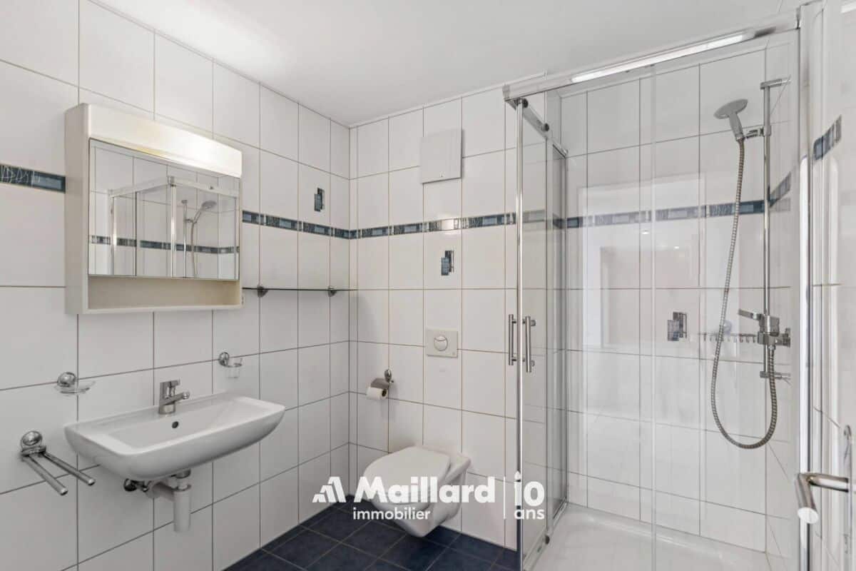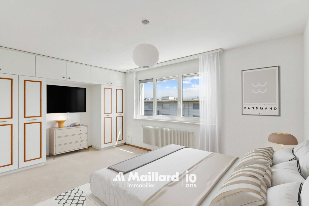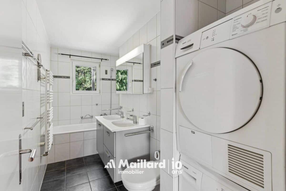 L'appartement est équipé de nombreuses armoires murales, d'une cuisine avec beaucoup de rangements et d'une colonne de lavage. Une place de parc couverte et une cave complètent ce bien (CHF 15'000.- en sus).
