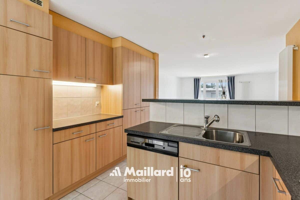 Idéalement situé à Givisiez, à deux pas de la gare, d'un arrêt de bus et à seulement 5 minutes de l'autoroute, cet appartement traversant de 107m² possède de nombreux atouts.