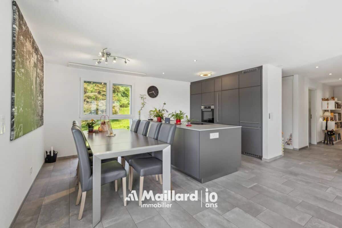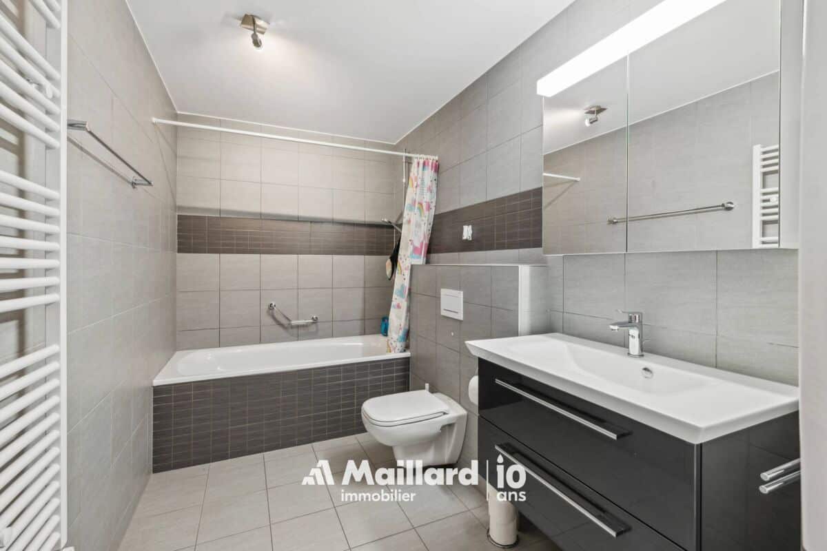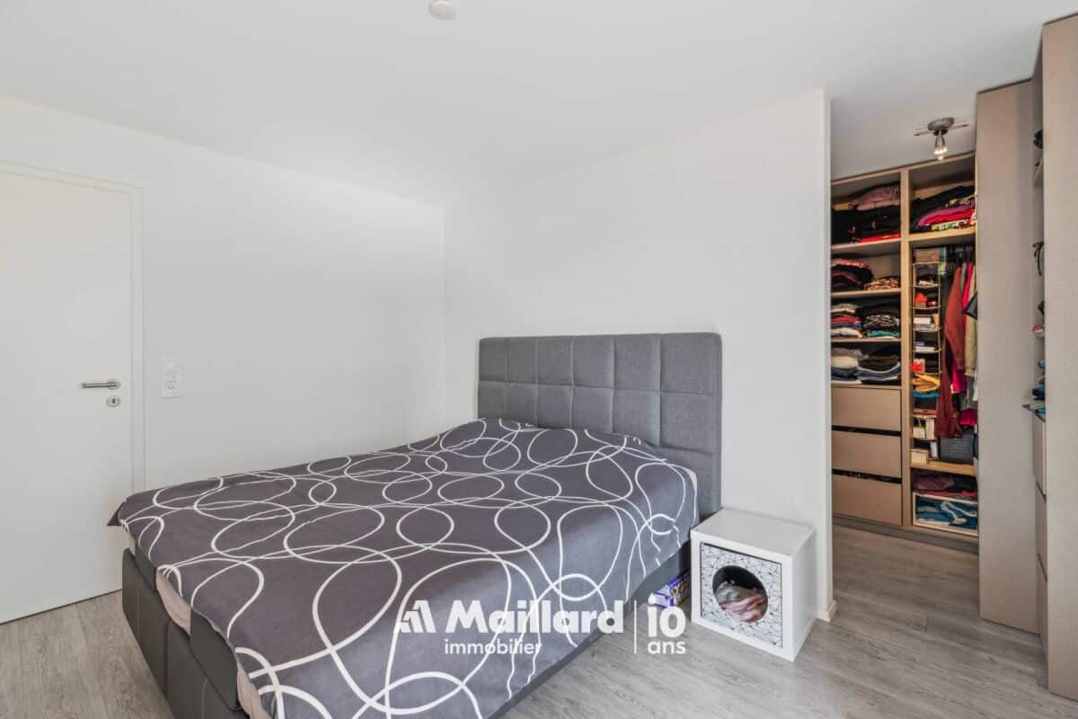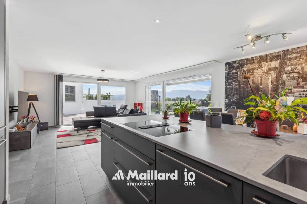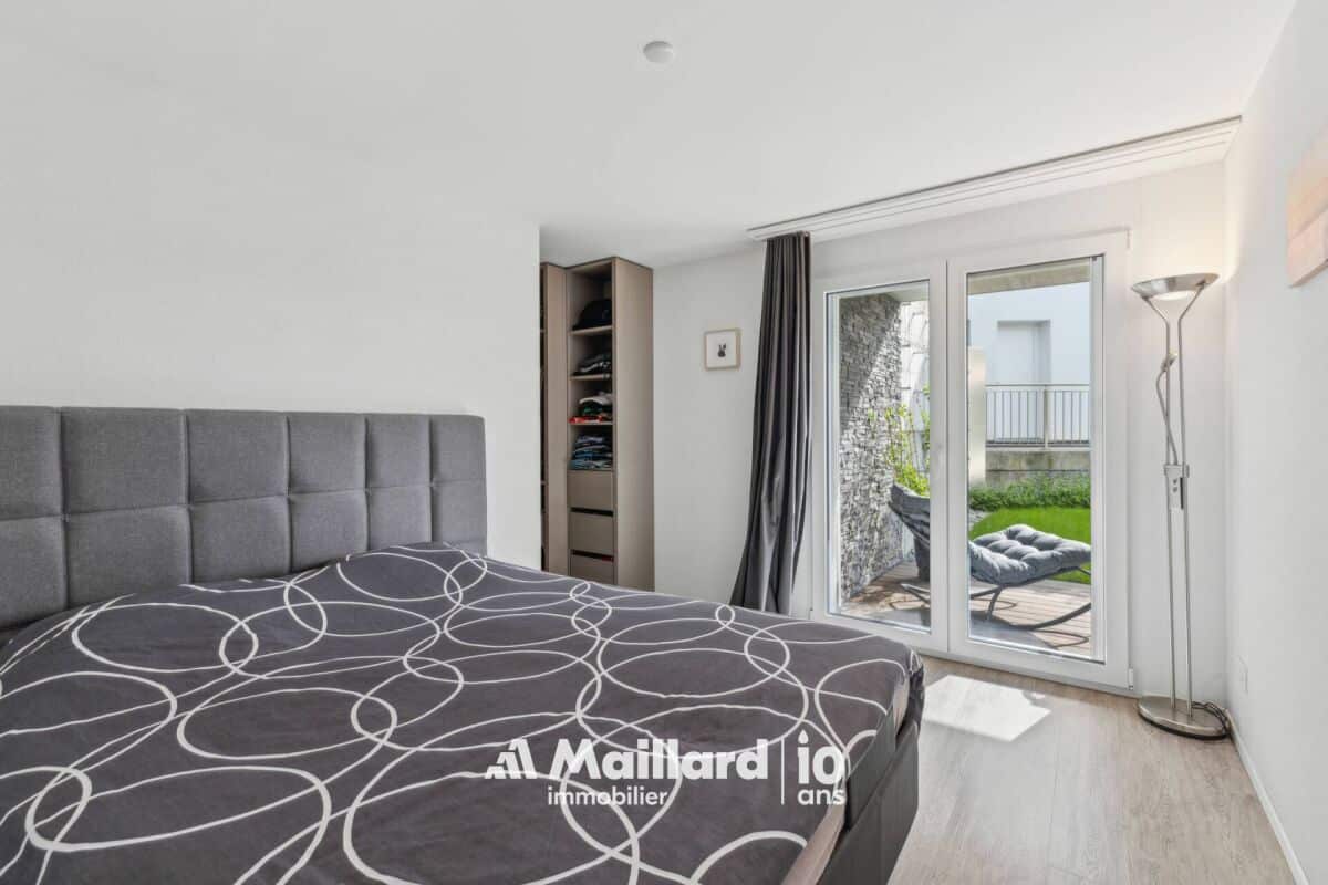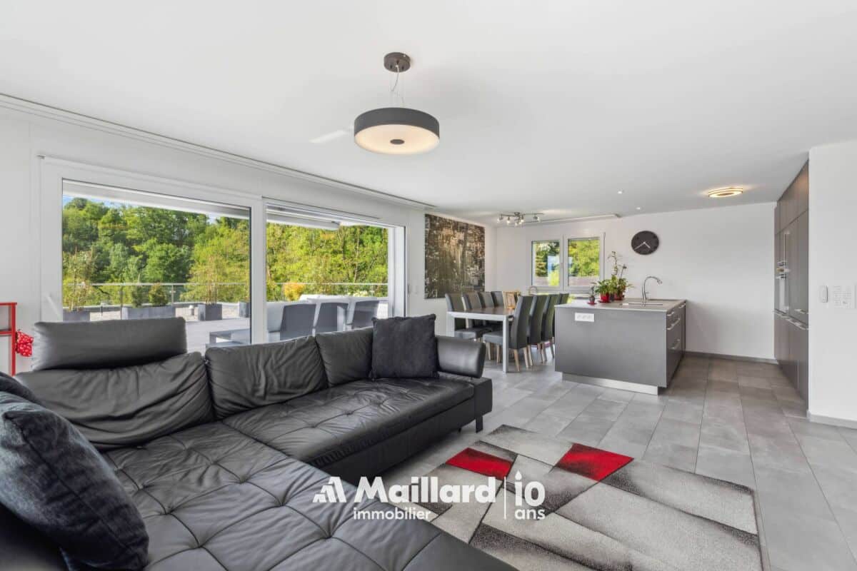 L'appartement bénéficie d'une vaste terrasse d'environ 60 m², idéalement orientée pour un ensoleillement optimal et offrant une vue dégagée sur le Jura ainsi que de magnifiques couchers de soleil. Cet espace extérieur est prolongé par une surface engazonnée de 30 m², accessible directement depuis deux chambres.