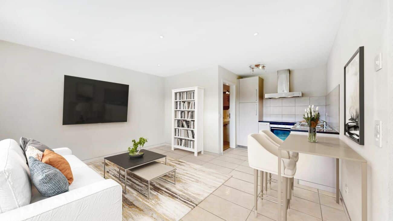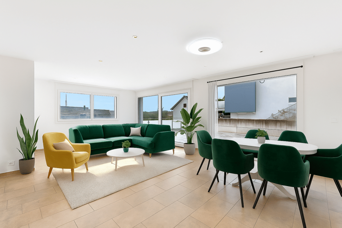 - La spacieuse pièce de vie baignée de lumière naturelle grâce à ses nombreuses baies vitrées, ouvre sur une vaste terrasse de 84 m² orientée plein sud, idéale pour profiter du soleil toute la journée.