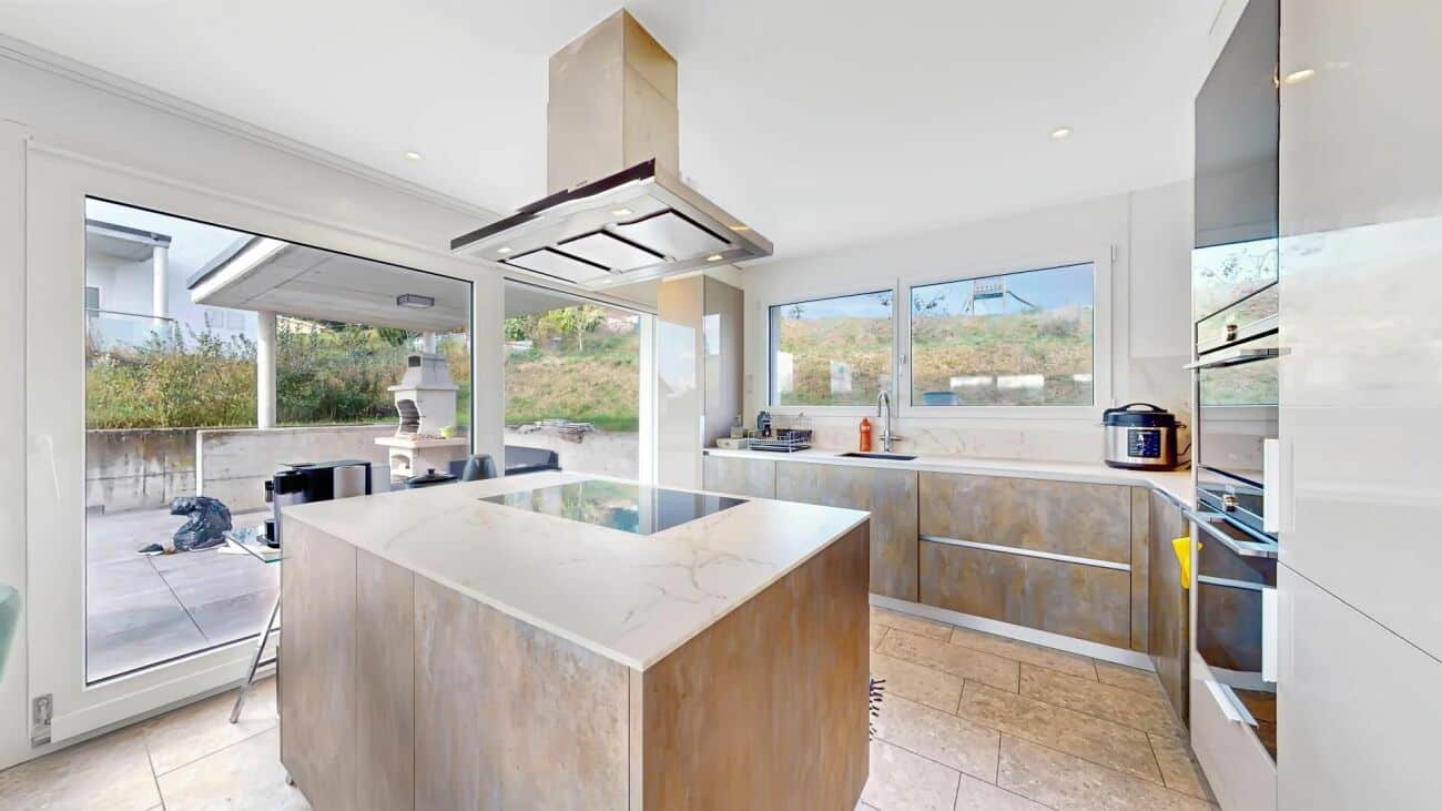 - La cuisine, refaite en 2021, est équipée d'appareils électroménagers Siemens, ainsi que d'un système unique permettant d'obtenir de l'eau fraîche et gazeuse directement du robinet.