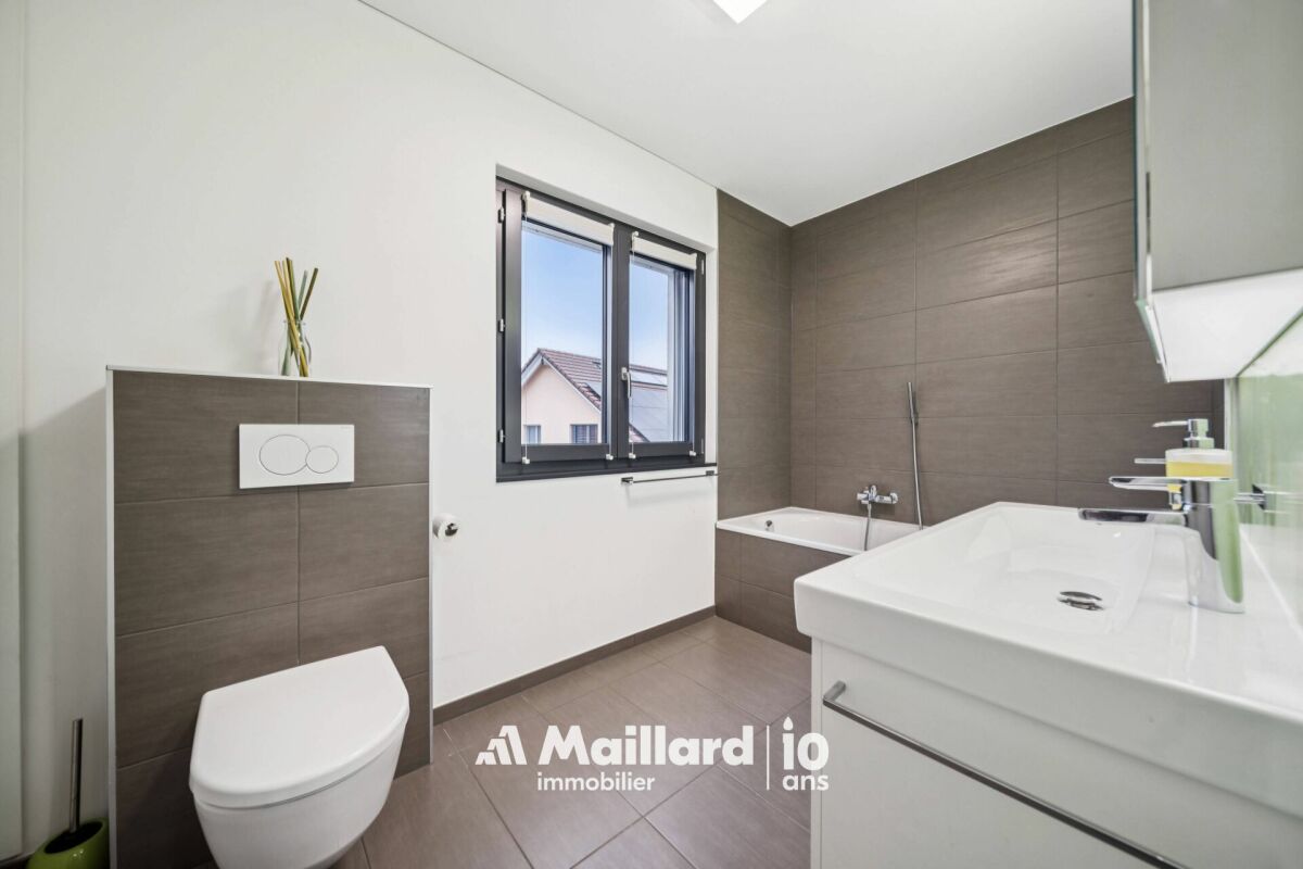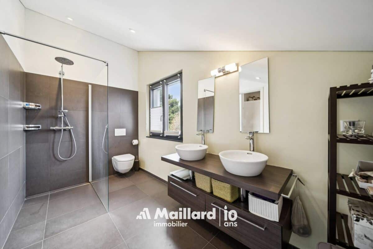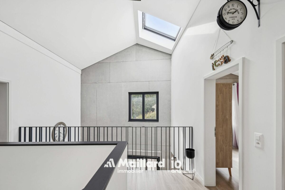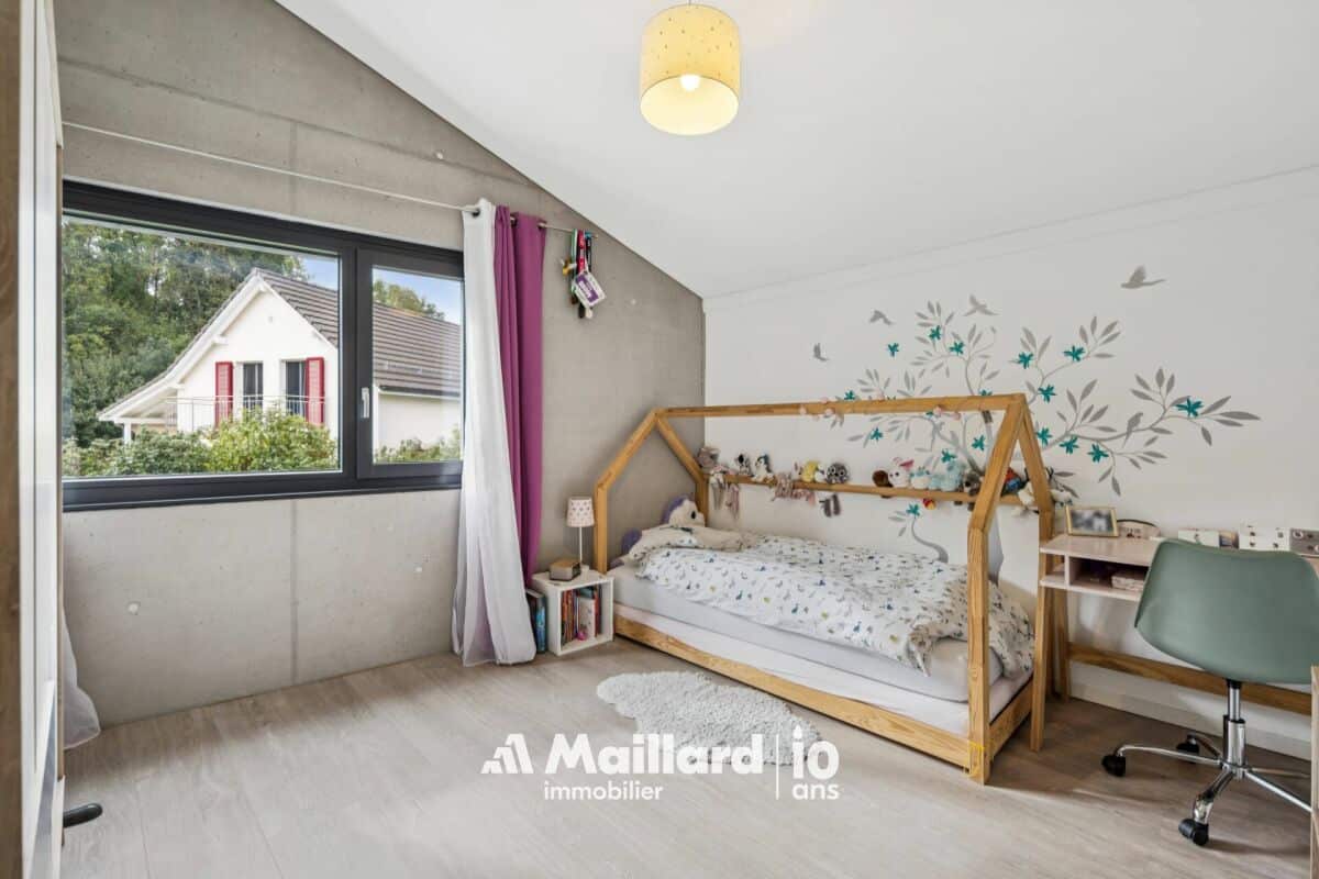 La propriété offre 5,5 pièces harmonieusement réparties. Le rez-de-chaussée accueille une chambre ainsi qu'une salle de bains avec douche, tandis que l'étage se compose de trois chambres supplémentaires. La chambre parentale bénéficie d'un dressing et d'une salle de bains attenante équipée d'une douche italienne. Une seconde salle de bains, avec baignoire, complète ce niveau.