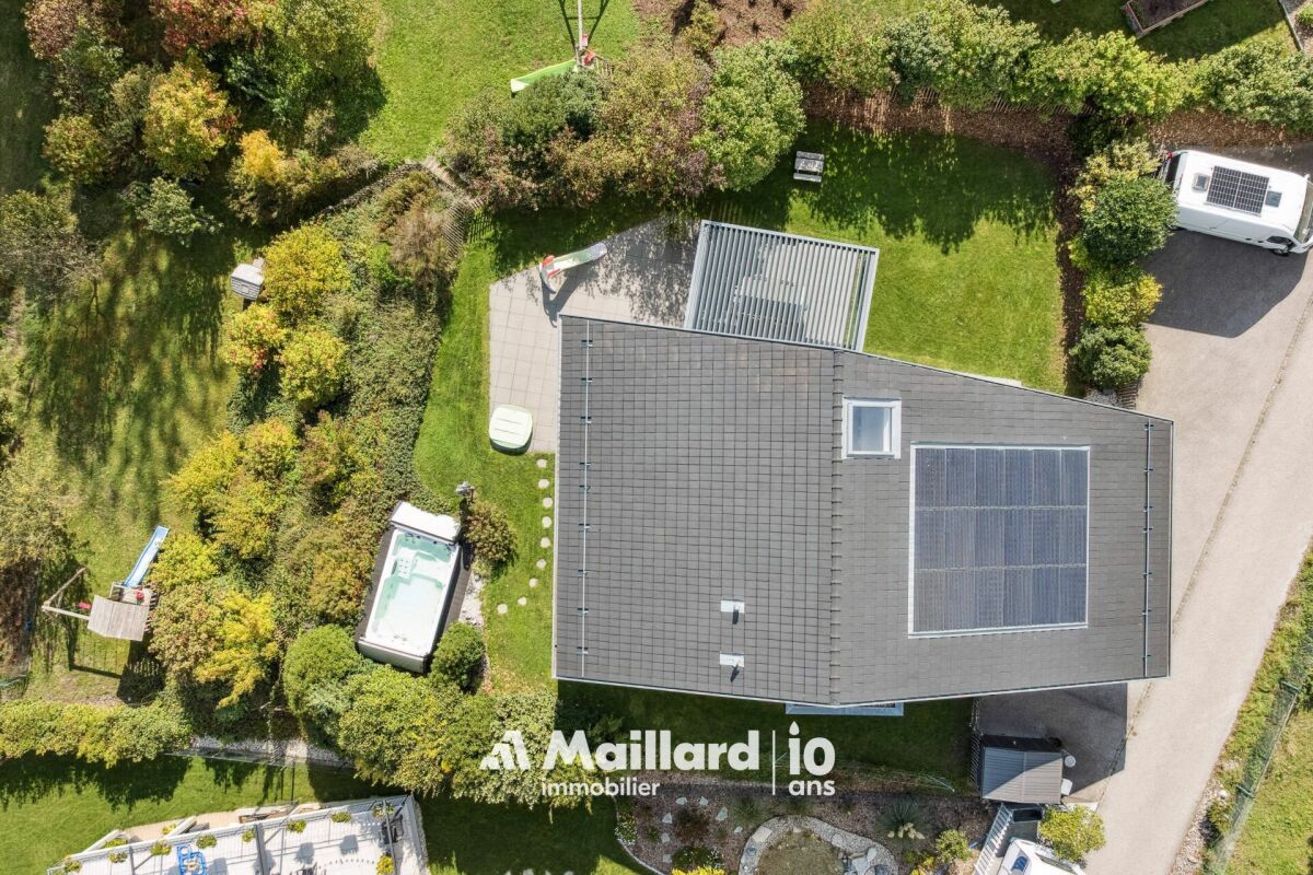 À l'extérieur, un agréable jardin met en valeur une pergola conviviale et un grand jacuzzi, parfaits pour des moments de détente. L'ensemble bénéficie d'équipements modernes tels que des panneaux photovoltaïques et une pompe à chaleur, garantissant confort et efficacité énergétique.