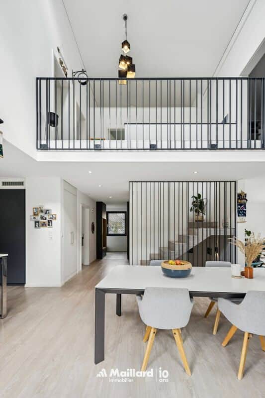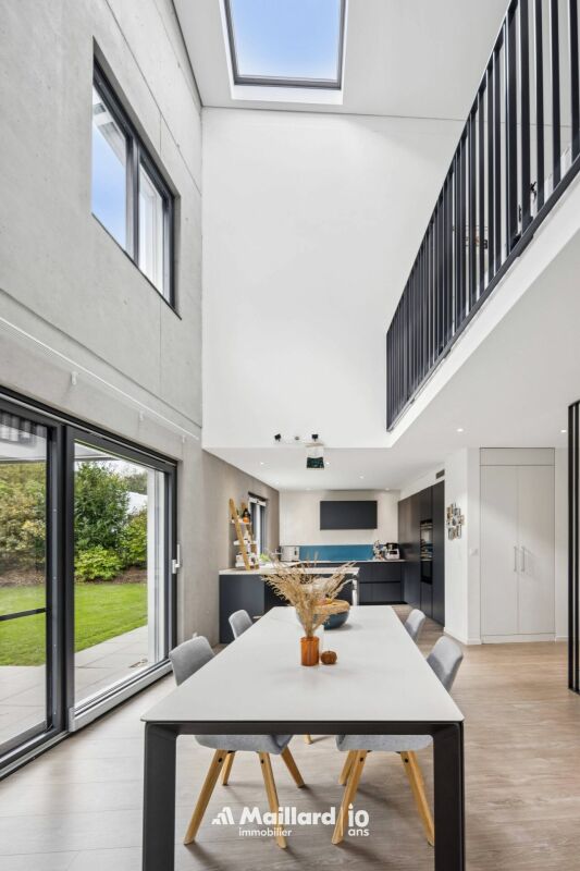 Les volumes intérieurs se distinguent par leur générosité et par une architecture aux lignes épurées, marquée par l'utilisation du béton brut et d'éléments métalliques. De grandes baies vitrées inondent les espaces de lumière et assurent une continuité harmonieuse entre intérieur et extérieur.