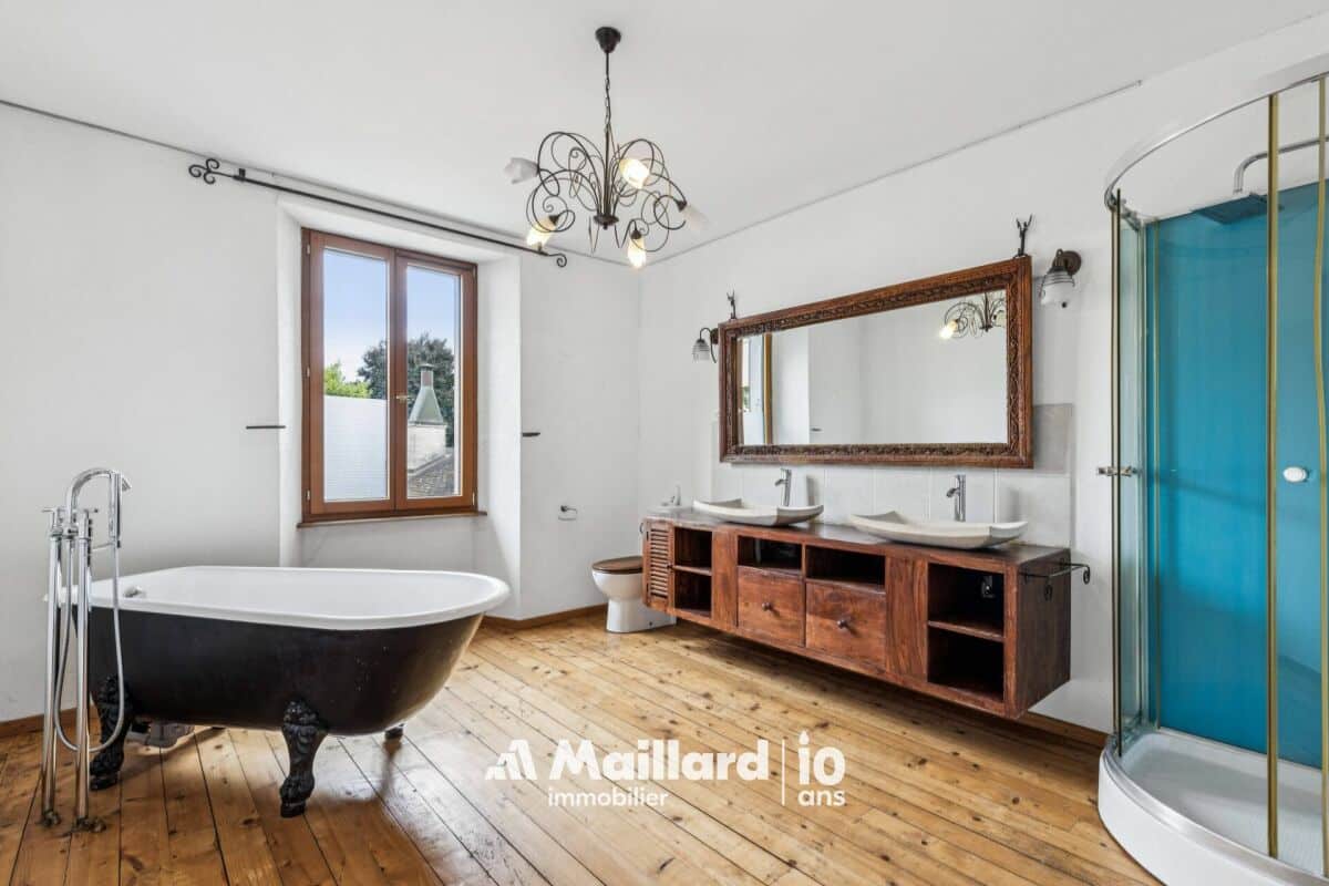 - Une grandes salle de bain avec baignoire, douche et WC